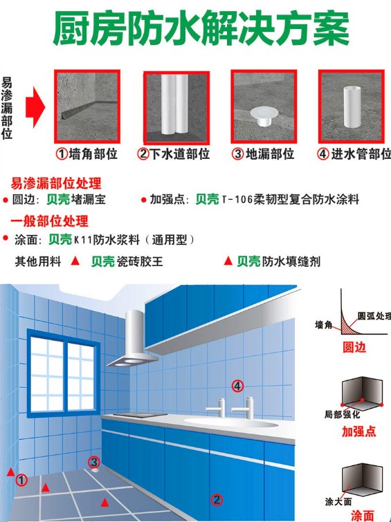 貝殼廚衛防水系統是由地面專用柔性防水材料加墻面專用剛性防水材料及細部處理輔料結合而成。獨特的配方設計,是“剛柔結合”細部增強的防水系統,結合了有機材料的彈性和無機材料的耐久性等優點,材料與基材的附著力高,可用于長期浸水的環境,同時還具有一定的柔韌性,可以抵御基層輕微的震蕩和微小位移。圖層效果不露圖,防水效果更放心。