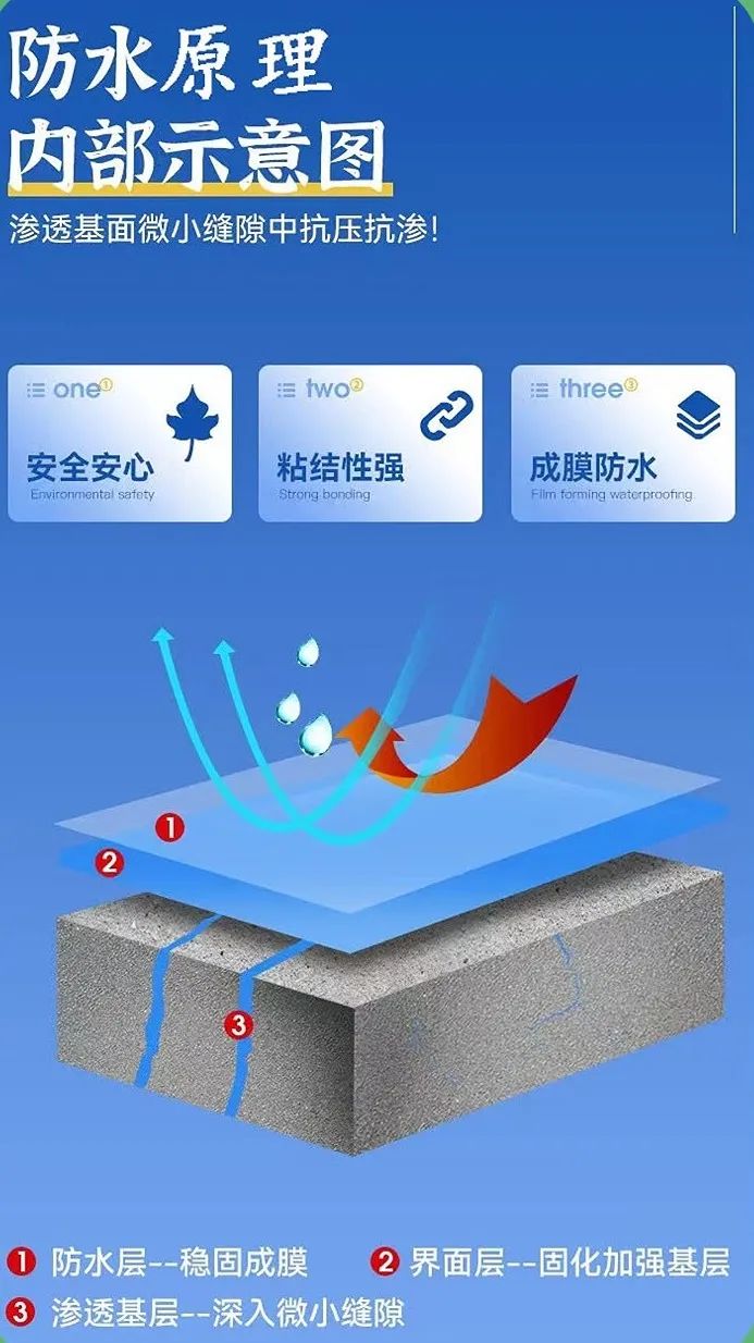 5、涂層具有一定透氣性,及時(shí)基層潮濕也不會(huì)發(fā)生防水層起鼓現(xiàn)象