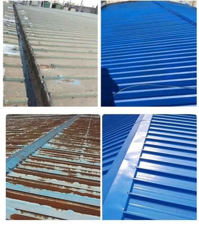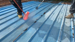 清理基面:第 一步,彩鋼瓦表面的鐵銹需要清理干凈,把基板完 全暴露出來。建議使用高壓水槍對基面進行全 面清洗,特別是屋脊、瓦槽、天溝部位,否則影響涂料對基板的附著力。另外,如果基板上有鐵銹灰塵殘留,可以使用除銹鈍銹劑進行除銹處理。