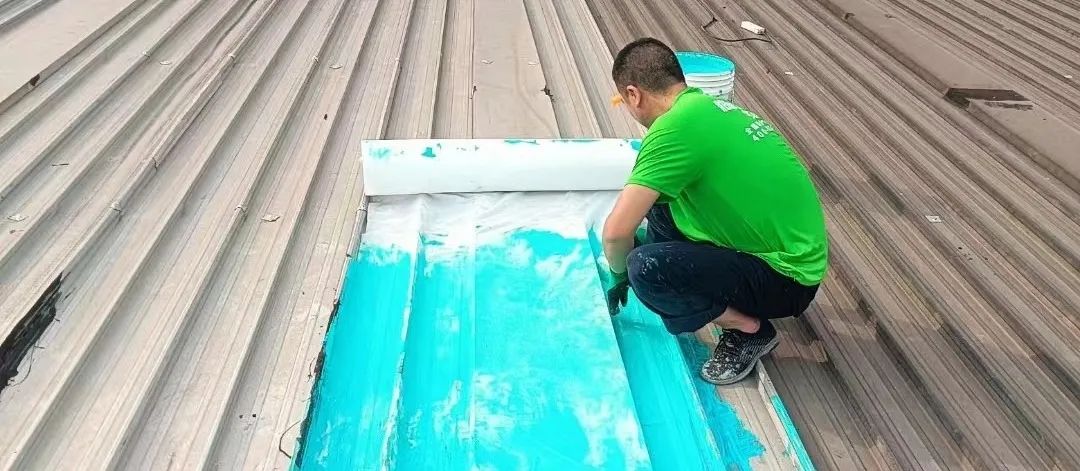 細部節點處理:基層處理完畢后,對排查出來的缺陷部位及彩鋼瓦搭接縫處,進行貼布做一布四涂加強處理,不好直接貼布處理的,可用耐候膠打膠處理后再進行貼布做加強處理。