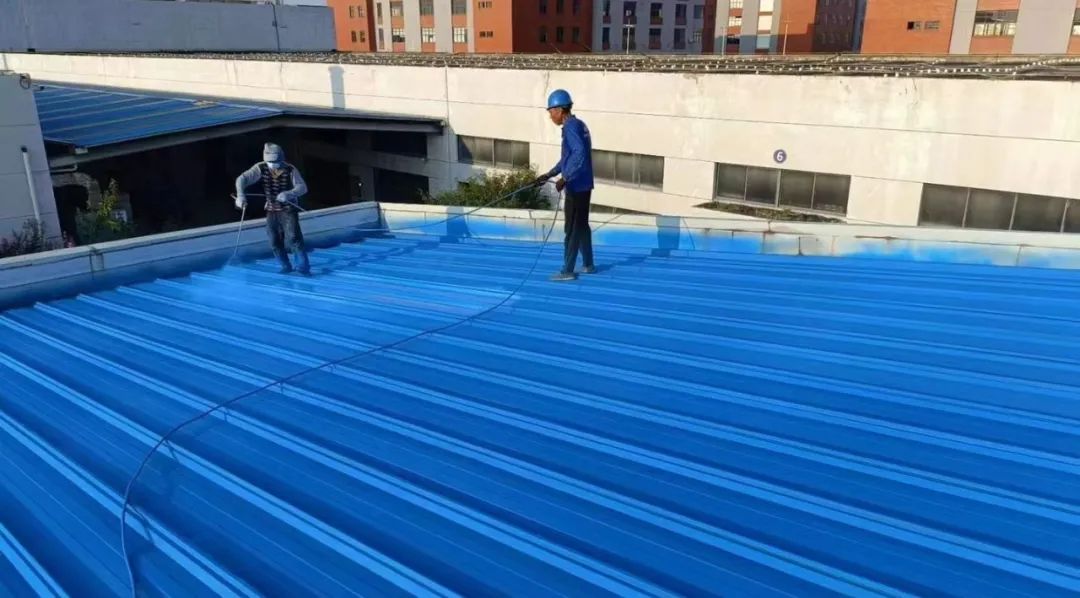 整體進行防水涂料施工:待細部節點處理完畢后,將涂料攪拌均勻,從屋面頂部一端向另一端開始噴涂,噴涂過程中隨時注意查看噴涂情況,防止出現漏噴現象,噴涂以不漏噴無流淌為準。前一遍噴涂完成后,晾干8-12小時,以干燥不粘腳為準,可進行下一遍噴涂施工。