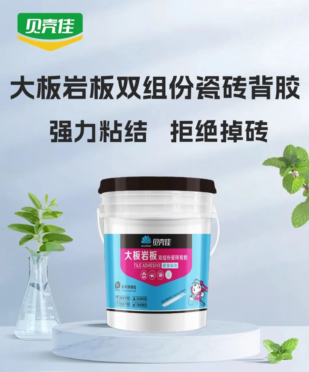 貝殼佳大板巖板雙組份瓷磚背膠是由改性高分子聚合物液料和粉料組成。能很好的滲入基層,增強基層與粘接砂漿的粘接力和粘接強度,同時該產品又具有一定的柔韌性,能應對一定的沖擊力,特別適合大板墻地磚、巖板、石材等吸水率低的無機磚材的界面增強處理。