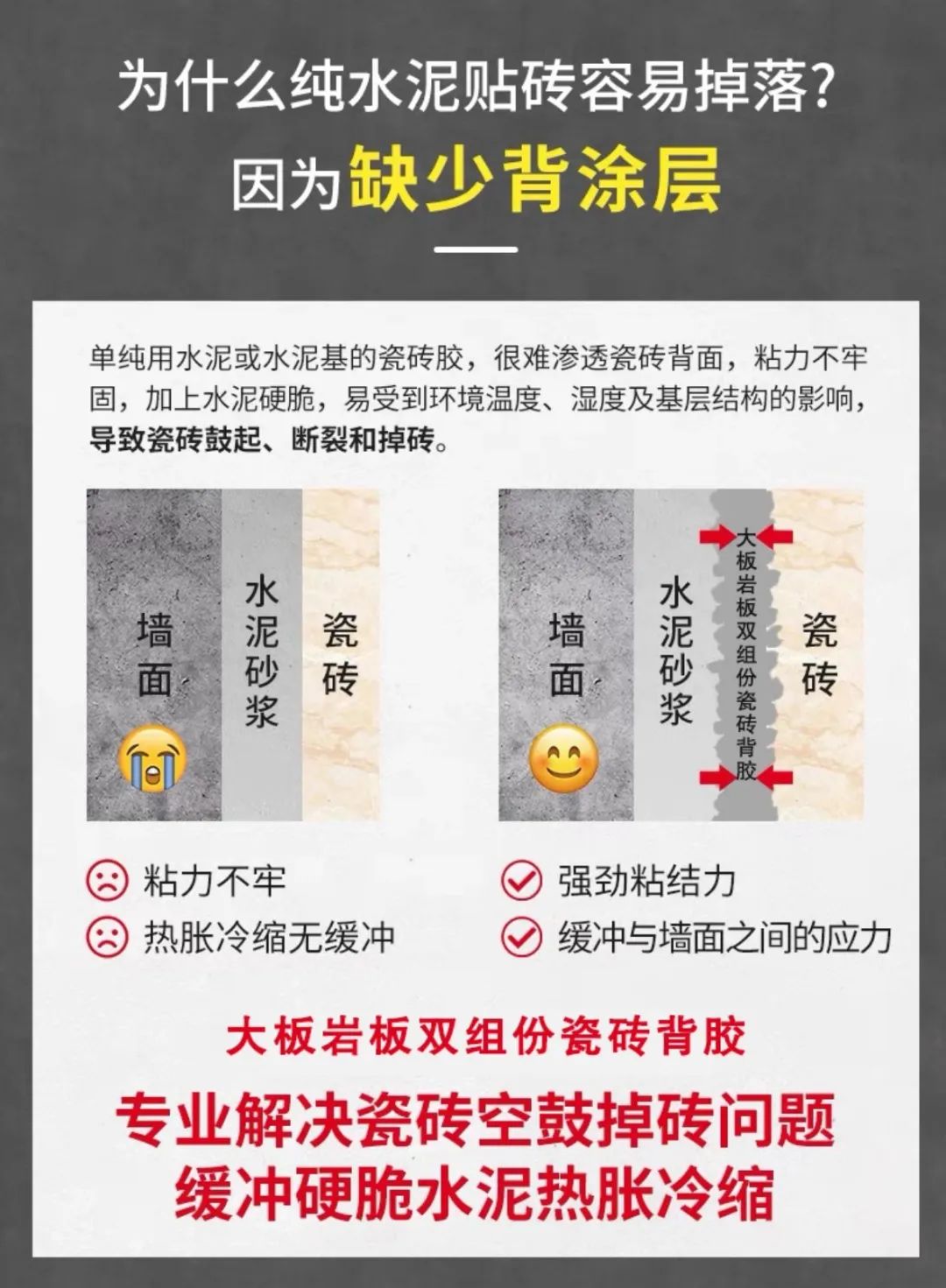 雙組份背膠中液料部分的聚合物乳液和粉料結合,形成柔韌性、強度更佳的界面層,既錨定了基層,又緩解了基層粘結材料等因熱脹冷縮、干縮濕脹產生的應力。從而解決了瓷磚空鼓脫落的問題。