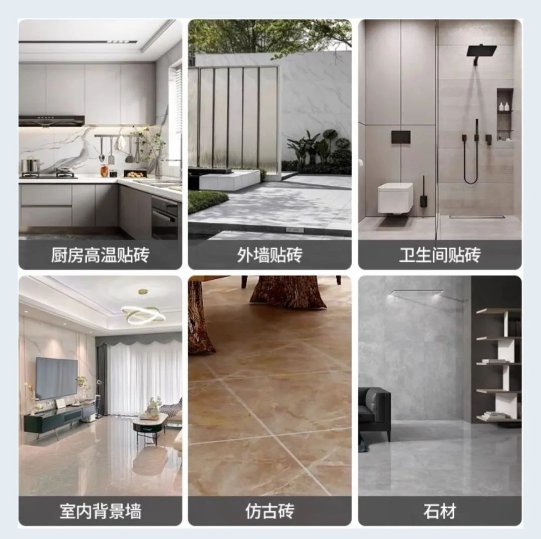 室內外低吸水率的玻化磚、仿古磚、大理石、巖板、各種瓷磚、天 然石材等磚背面的預處理,墻地通用