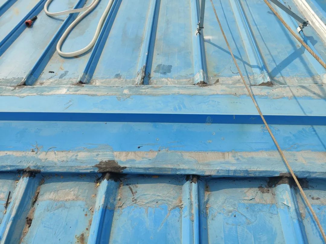 基層處理完畢后,對排查出來的缺陷部位及彩鋼瓦搭接縫處,進行貼布做一布三涂加強處理,不好直接貼布處理的,可用耐候膠打膠處理后再進行貼布做加強處理。